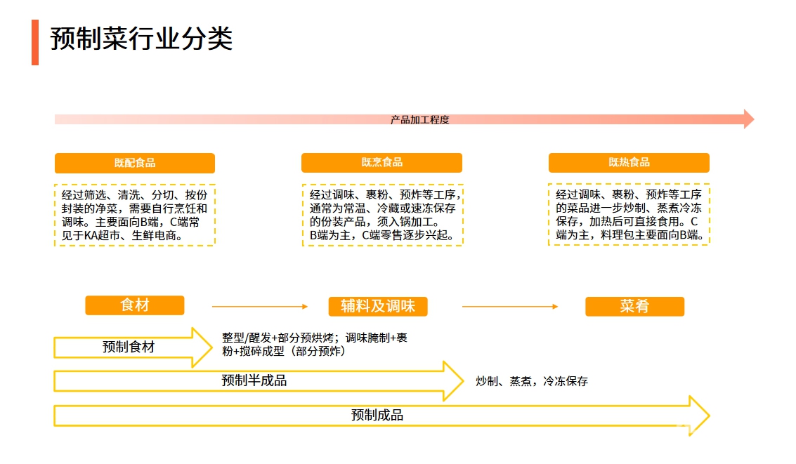 預制菜行業可按照加工程度以及原輔料來劃分,可以分成凈菜類、預制半成品類以及預制成品菜類。