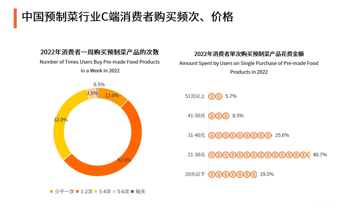 調研數據顯示,每周購買預制菜品1-2次的消費者占52.0%,每周都購買預制菜的消費者占比達88%。價格方面,消費者單次消費21-30元占比最多,其次是31-40元。